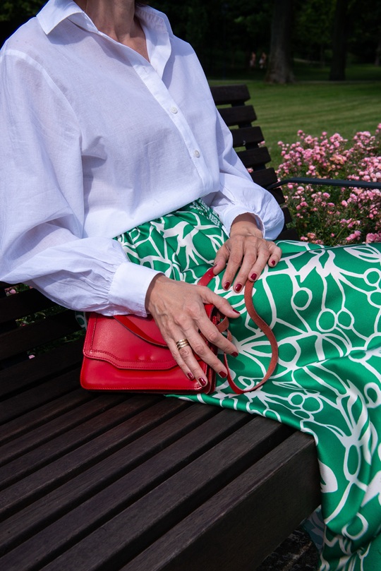 Biała koszula z przewiewnej bawełny to klasyka letniego stylu. Lekkość, komfort i elegancja – ideał na ciepłe dni. Zwiewna, kolorowa spódnica dodaje energii i optymizmu. A czerwona torebka? To mocny akcent, który przełamuje kolorystykę i dodaje wyrazistości.