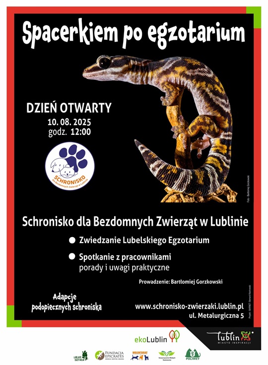 Tym razem nie tylko psy i koty będą bohaterami Dnia Otwartego w Schronisku dla Bezdomnych Zwierząt w Lublinie, ale również iguany, żółwie, ptaszniki czy agamy – podopieczni lubelskiego egzotarium. Już w najbliższą niedzielę (10 sierpnia) miłośnicy zwierząt będą mieli wyjątkową okazję, by z bliska zobaczyć egzotyczne gatunki i poznać ich historie. Zwiedzanie tej unikalnej w kraju placówki to główny punkt programu wydarzenia „Spacerkiem po egzotarium".