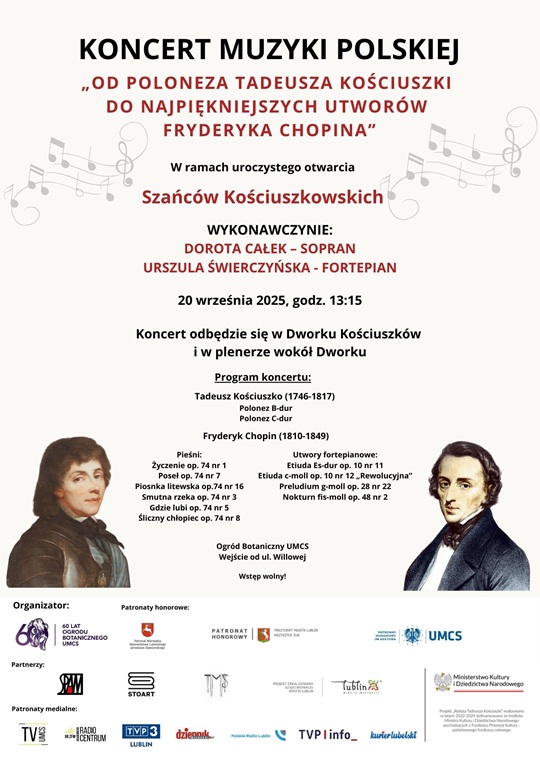 Jubileusz uświetni koncert „Od poloneza Tadeusza Kościuszki do najpiękniejszych utworów Fryderyka Chopina”, w wykonaniu Doroty Całki (sopran) i Urszuli Świerczyńskiej (fortepian). Po południu, w godzinach 15.00–17.00, zaplanowano bezpłatne zwiedzanie ogrodu z przewodnikami.