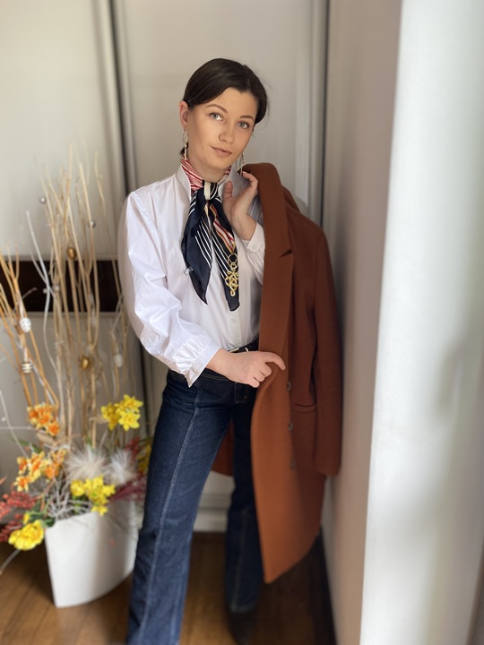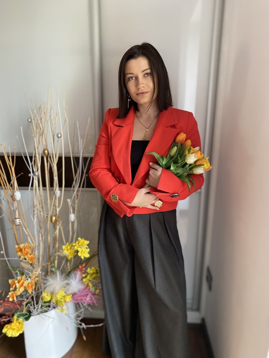 Całość dobrze uzupełnia marynarka w kolorze, która porządkuje sylwetkę i dodaje wyrazu.